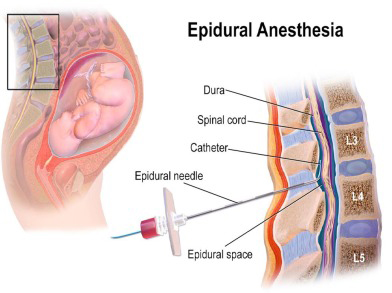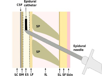 - 標準的な方法として、硬膜外麻酔(Epidural Anestesia)を行います。以下の図のごとく、ちょうどおへそ位の高さで背中側から局所麻酔をして薬剤を注入するための細いチューブを硬膜外腔に挿入し留置します。